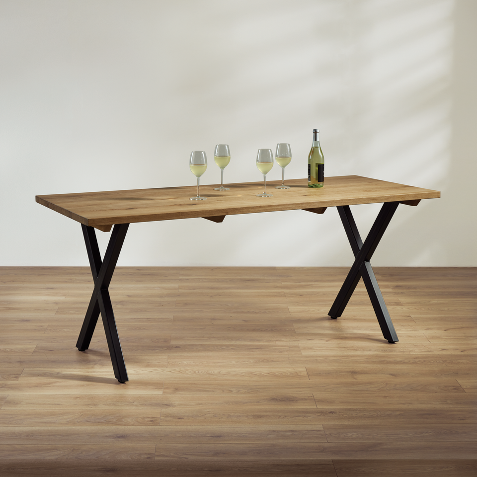The DOUBLE CROSS table base is is manufactured from metal with a black or clear matt finish. This dining height base is extremely strong and features a striking design. The adjustable feet give extra stability. This table base is suitable for use both indoors and outdoors but please be aware that areas with high humidity or coastal climates may cause the materials to weather more than usual.