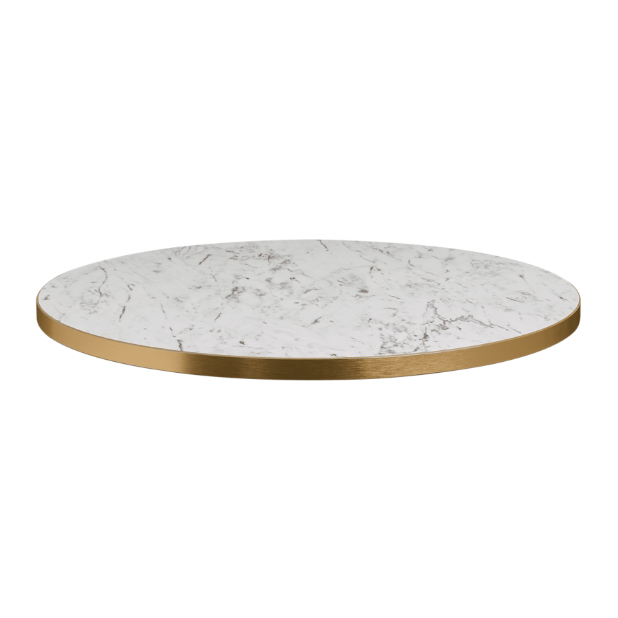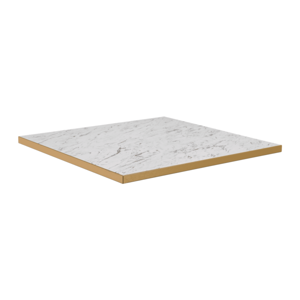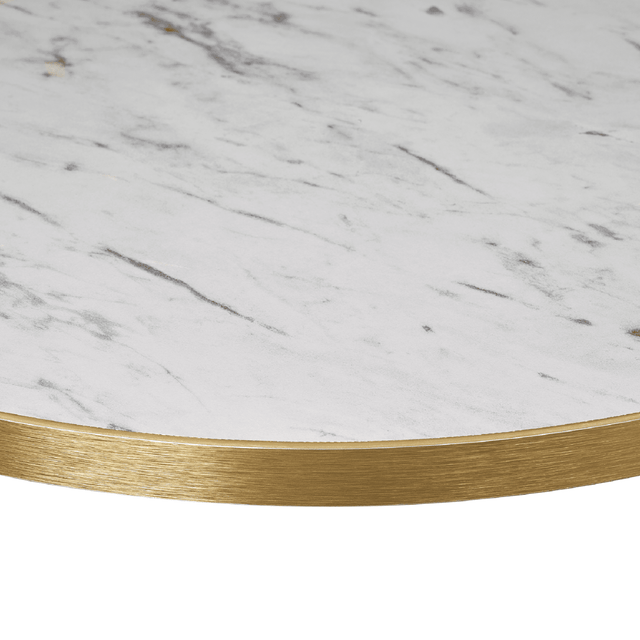The striking White Carrara Marble effect laminate features a 2mm Gold ABS edging which contrasts with the the distinctive design of the top.